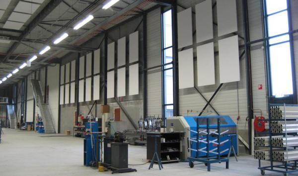 ) geluidsabsorptie aan wanden en plafond in productieruimte voor aluminium kozijnen