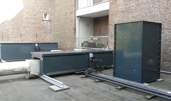 Omkastingen rond luchtbehandelingskasten en een coulissedemper rond een dakventilator op het dak van een club / theater in Rotterdam