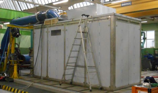 Geheel roestvrijstalen (AISI 316) omkasting (1 van 2) voor door elektromotor aangedreven pompinstallatie, hier tijdelijk opgebouwd op de teststand van de pompleverancier in Italië.