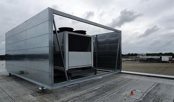 Driezijdige modulaire geluidsisolerende en -absorberende wandopstelling rondom een koelmachine op een opslaghal